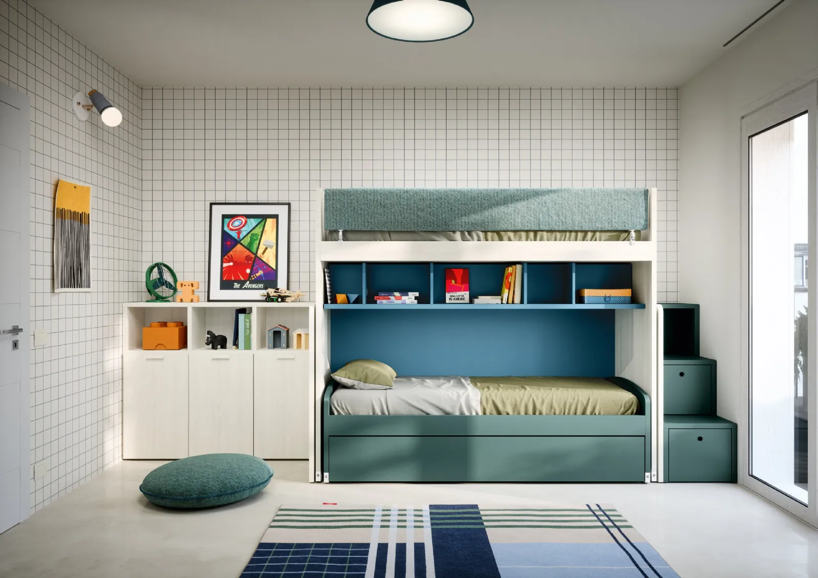 Arreda stanzette moderne con le Camerette a soppalco Nidi! Il modello Soppalco Letti Estraibili in melaminico è per bambini.