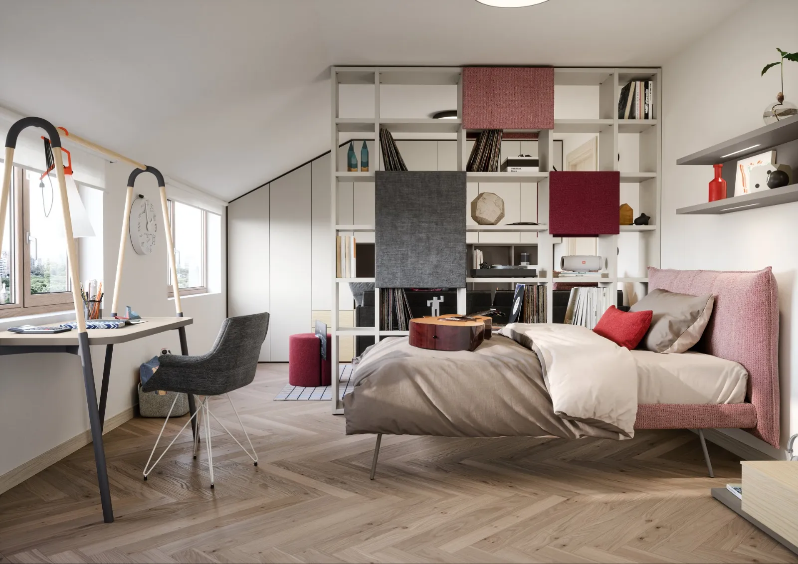 Il letto singolo Pillow in tessuto nella fotografia, tra i modelli imbottiti moderni di Nidi, è perfetto per garantire il sonno più profondo.