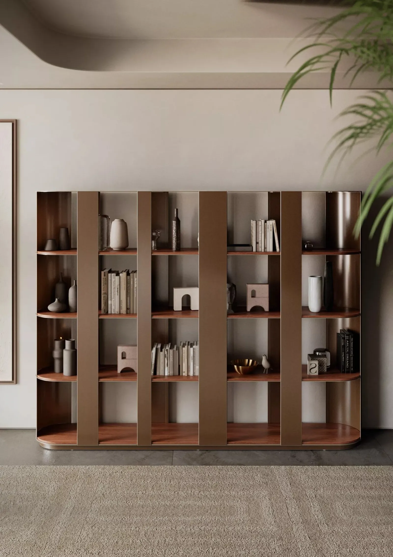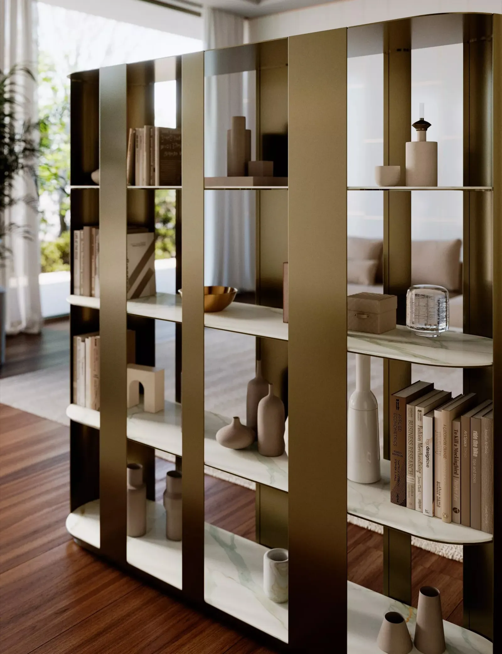 Finiture di pregio e linee decise: scopri la libreria Helena di Bontempi tra le più belle Librerie design divisorie.