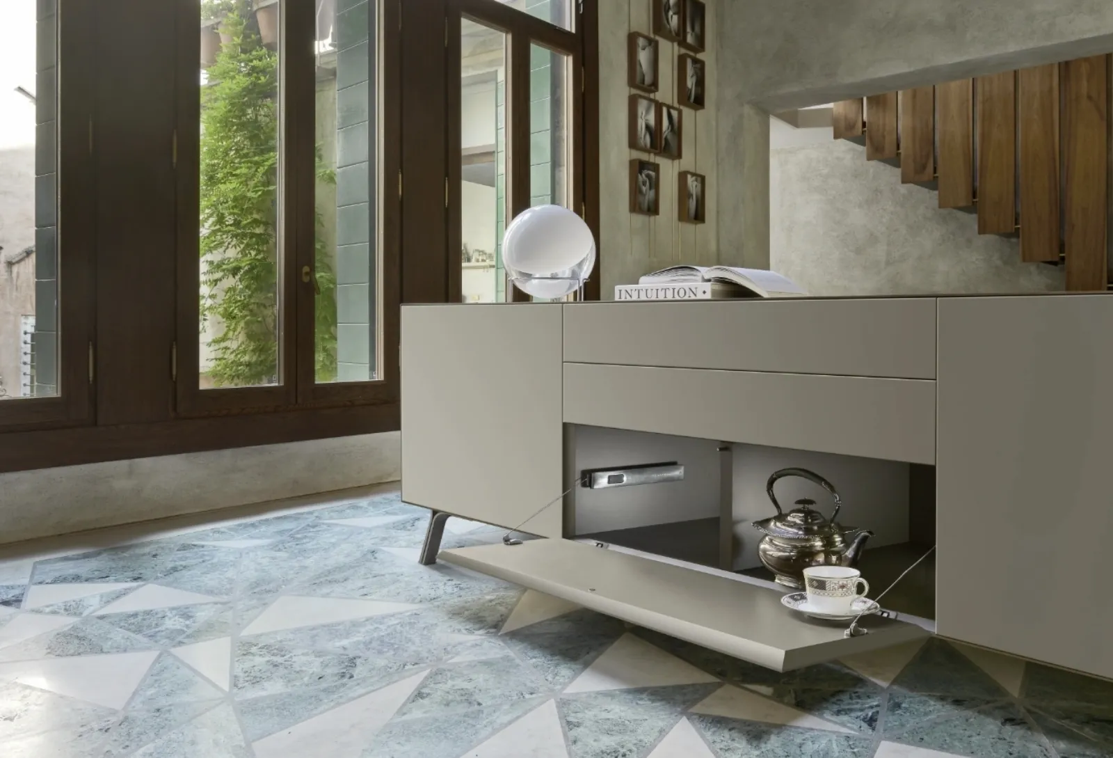 Arreda un soggiorno dinamico e operativo con questa madia Domino Mono 01 di Sangiacomo: scopri le più esclusive Madie in laccato opaco.