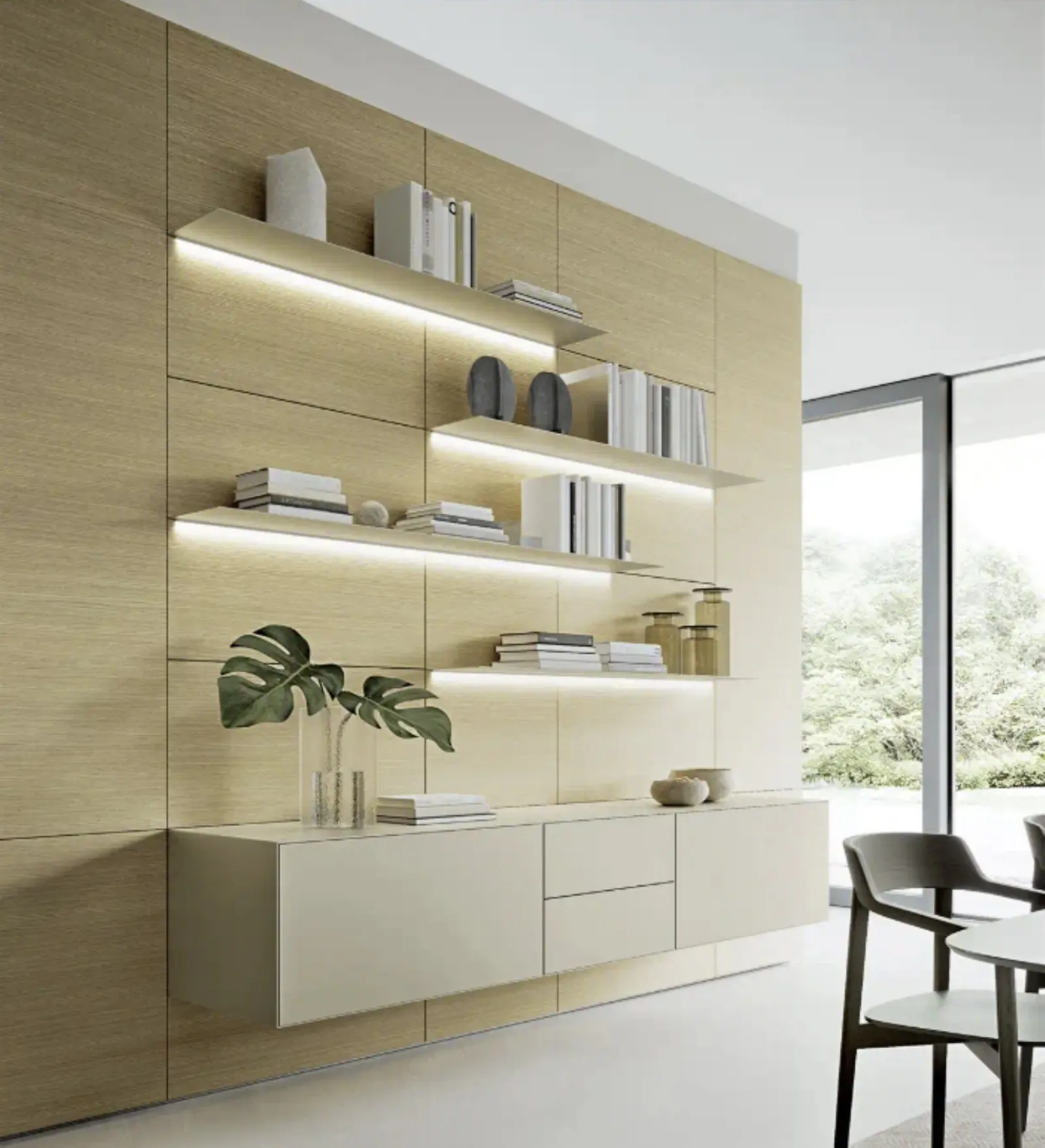 Vuoi arredare un living operativo e pratico? Ti offriamo la parete attrezzata Domino Boiserie 01 Sangiacomo dalle linee decise moderne.