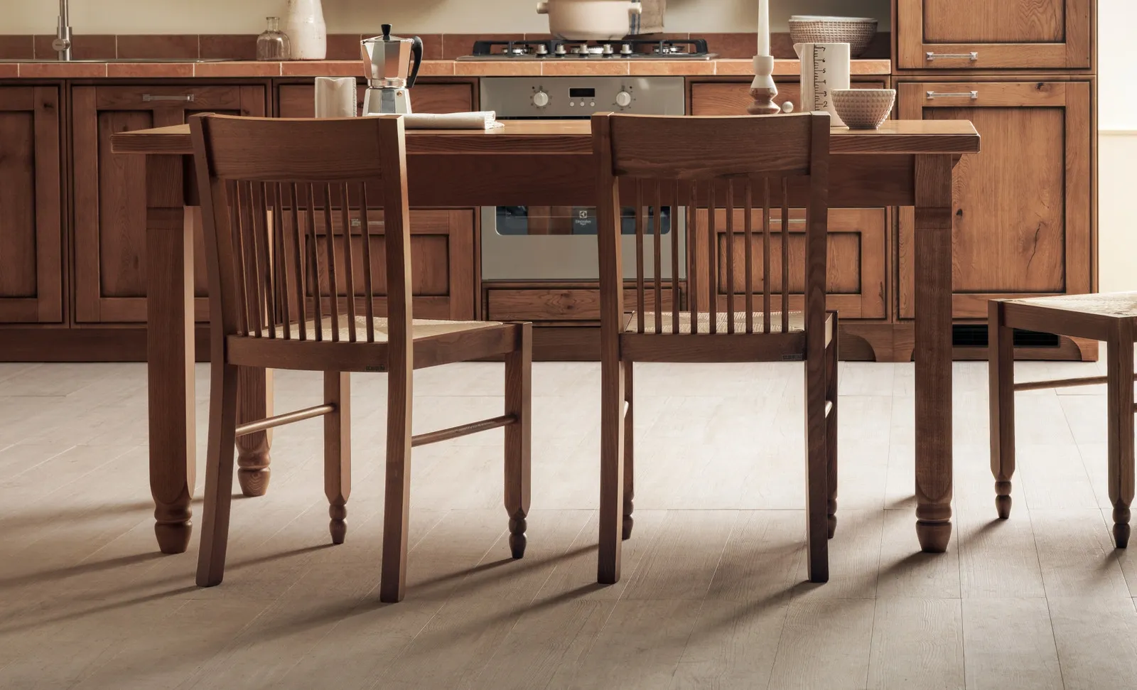 Se vuoi tavoli fissi classici, ecco a te il modello da cucina in legno Gea della firma Scavolini.
