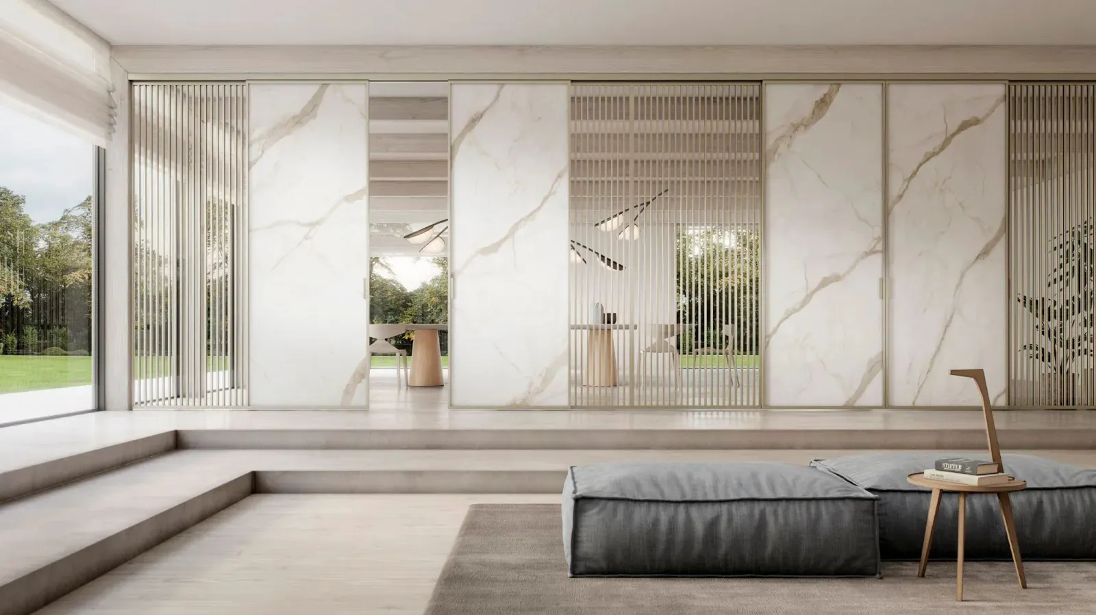 Se desideri porte per interni scorrevoli design, clicca e scopri il modello con telaio in alluminio Zeus Sospesa effetto Marmo di Doal!